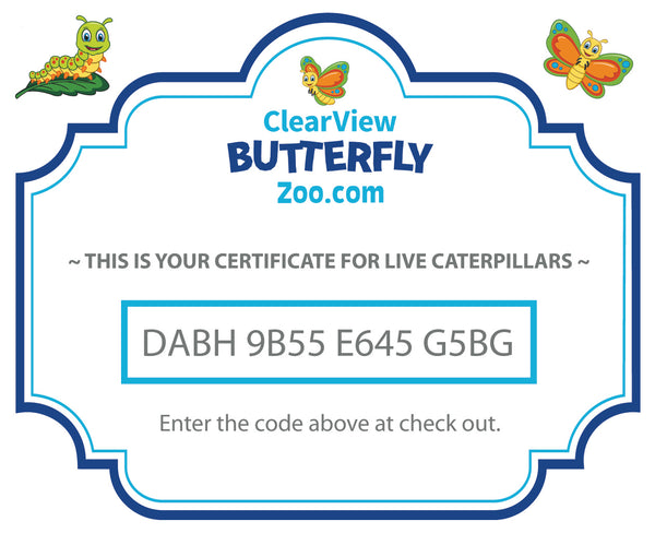 This butterfly growing kit ships with a voucher to redeem the caterpillars at a future date. Here's what you will receive: